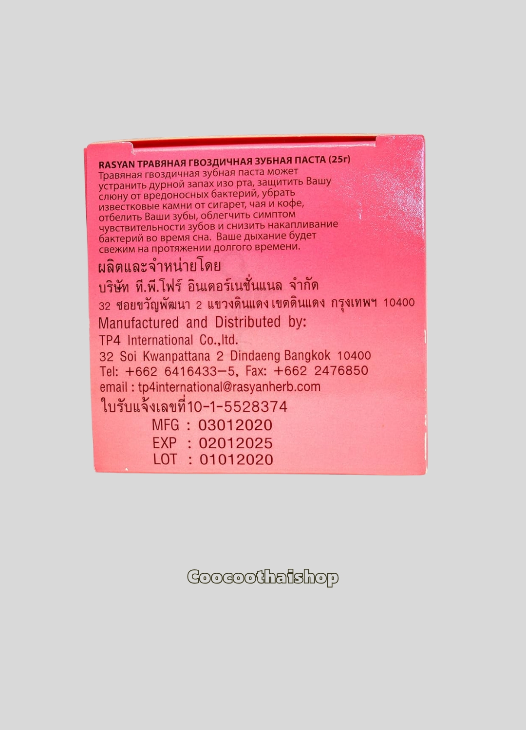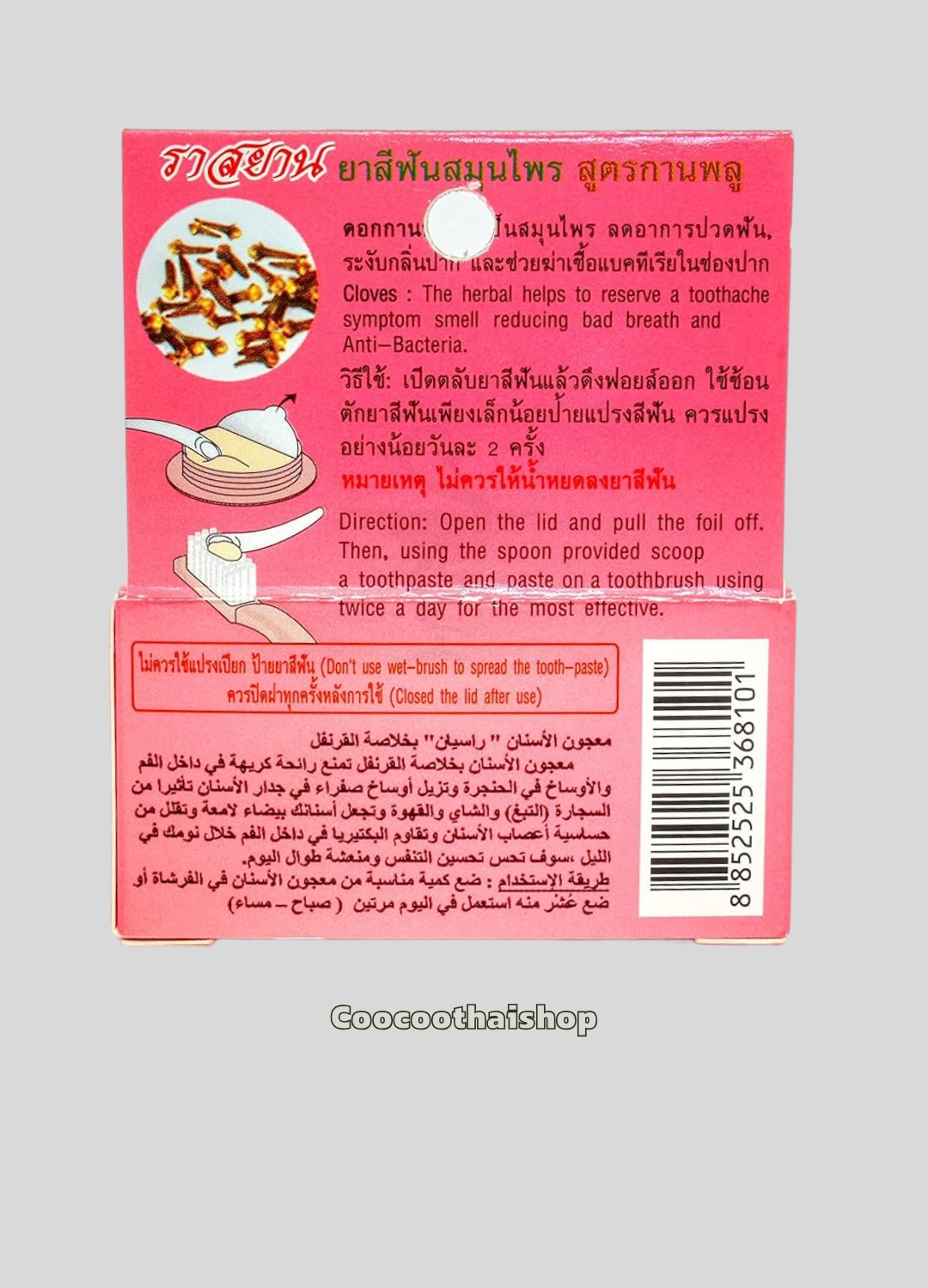 خمیر دندان گیاهی با فرمولاسیون طبیعی میخک، یکی از محبوبترین محصولات گیاهی تایلندی است که بهصورت مؤثر بوی بد دهان را از بین میبرد و حس تازگی طولانیمدت ایجاد میکند. این خمیر دندان با استفاده از ترکیبات طبیعی مانند روغن میخک و منتول، دهان را کاملاً تمیز کرده و احساس پاکی و شادابی عمیقی بهجا میگذارد—بهگونهای که گویی دندانها کاملاً پولیش شدهاند. که هر کدام در بستهبندی پلمپ و کاملاً بهداشتی عرضه میشود.